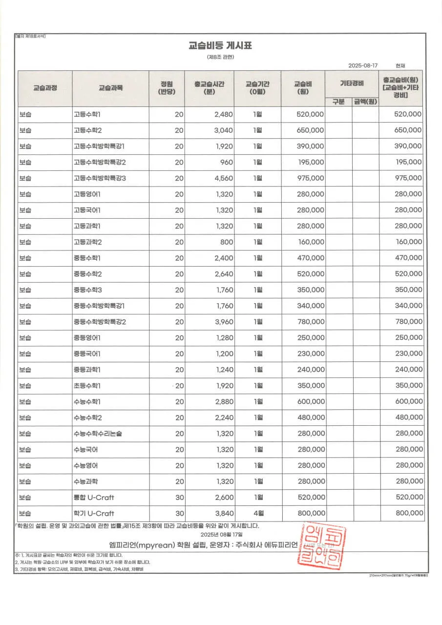 엠피리언 학원 수강료는 [교육청령] 학원의 설립운영 및 과외 교습에 관한 법률 시행령을 준수합니다.